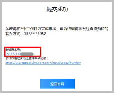 第五步 提交申诉,弹出“提交成功”界面,可获取申诉流水号,后续可通过申诉流水号,查询申诉进度