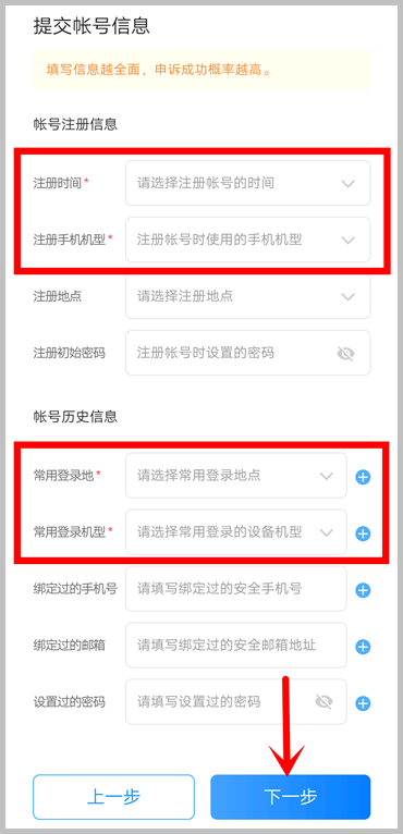 注:标“★”项为必填项,信息不全可能会导致申请审核不通过,建议您尽可能多提交相关信息。您提交的信息会加密传输,且仅用于申诉人身份确认使用。