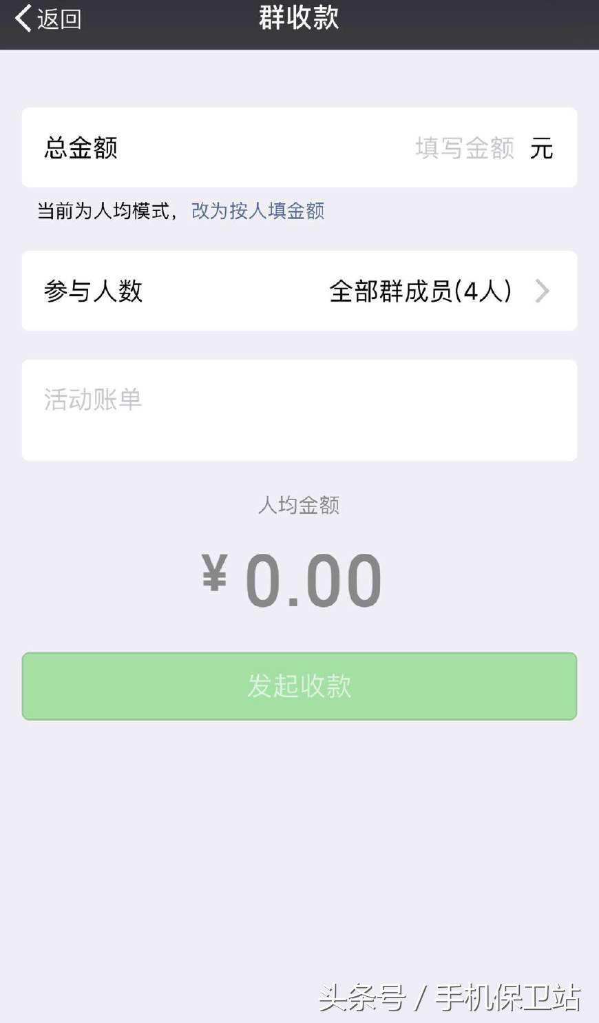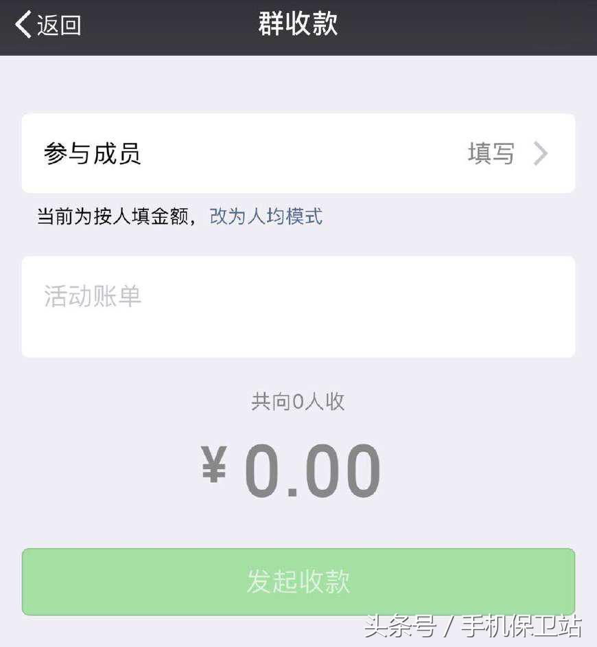 5.用户可以选择“按人填金额”模式,向群组里的人收取不同的金额;也可以选择“人均模式”,群里所有人付同等价格。