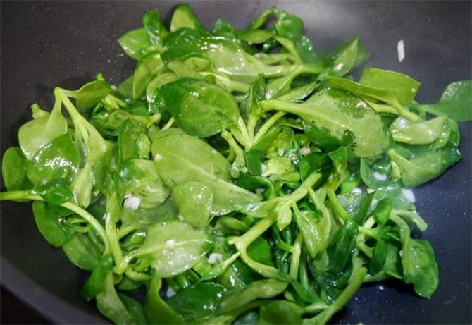 4. 加入田七菜翻炒,适量加一些水,避免炒焦。
