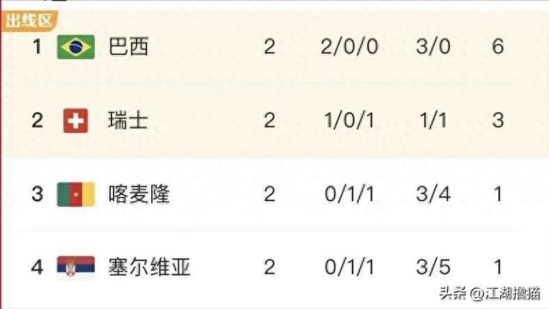 我们先从积分榜做整体分析,目前塞尔维亚队积1分,瑞士队积3分,塞尔维亚队本场比赛能击败瑞士队则可总体积4分小组出线(因为另一组喀麦隆队击败巴西的可能性不大),瑞士队保持战平理论上可能出线。