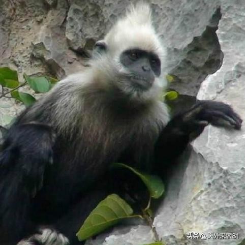 白头叶猴顾名思义叫做叶猴,因为它是吃树叶的以植物嫩叶,枝条为食,它的食物80%-90%都是树叶,在它的环境,在它生活的环境里面,有各种各样树叶。它根据每个季节,喜欢吃什么树叶,然后采摘一些什么样的树叶,而且采食量并不高。因为它的肚子里面它的胃有一个能够分解纤维素的这么一个室,所以它吃的树叶下去就能够很快就能够分解了。晚上白头叶猴一般要住山洞,它长期住在这个山洞,到了晚上就在洞口排泄。所以时间一长,就在洞口的下方就有一些深褐色的这么一些排泄物。