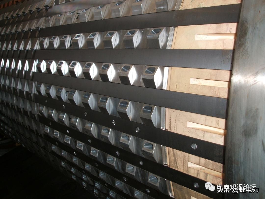 槽楔材料为LY12高强度铝合金(除大齿旁的槽楔材料为铍钴锆铜外),加工形成风斗。处于进风区的为吸风风斗,处于出风区的为甩风风斗。与定子相对应的进、出风区相间的气隙取气斜流通风系统,使转子绕组在槽内的平均温度和最高温度都较低。