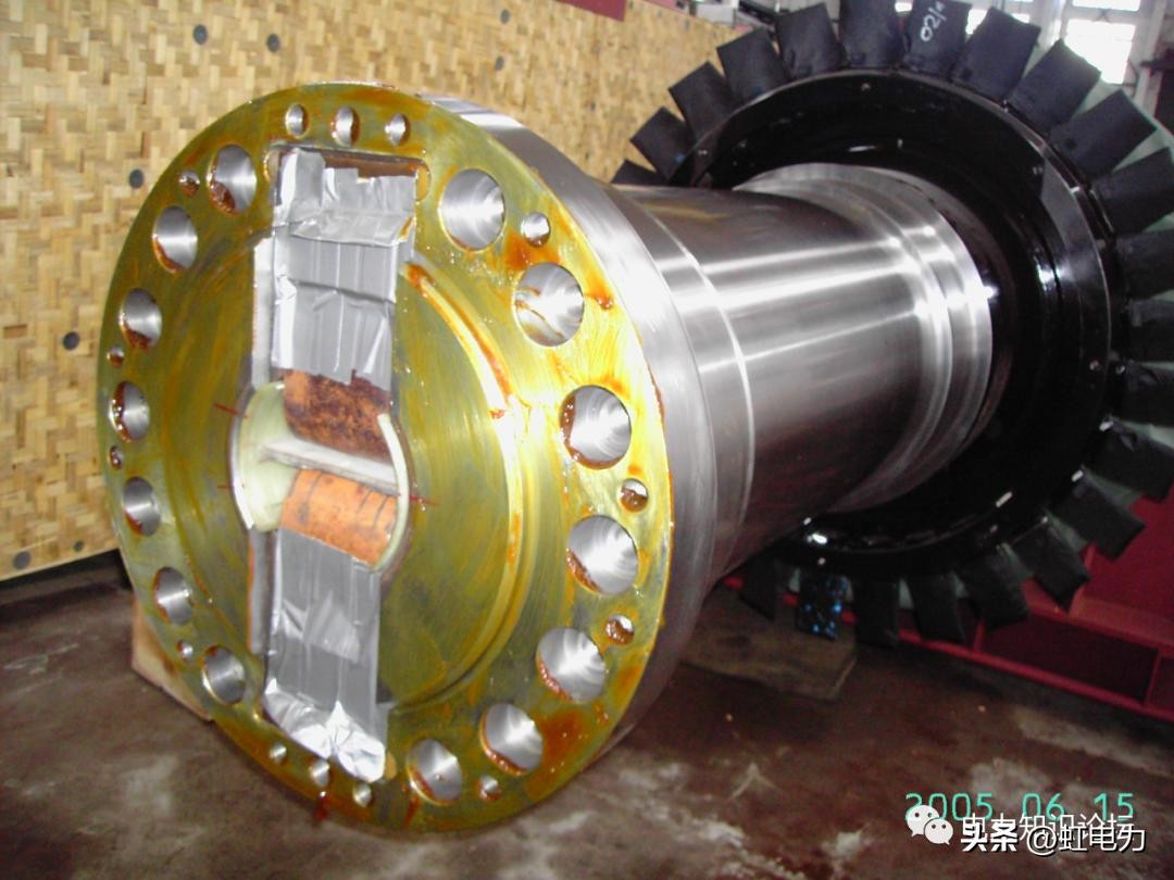 汽轮发电机转子主要由转子锻件、激磁绕组、护环、中心环和风扇组成。