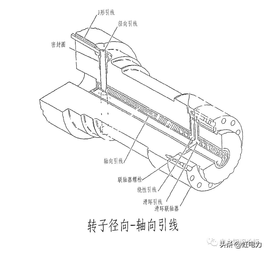 轴向导电杆和径向导电螺杆采用高强度的锆铜合金等材料,能承受结构件离心力所产生的高应力。导电螺钉外表面 热滚包环氧玻璃布绝缘,导电螺钉与转轴之间的密封采用人字型特制橡胶密封垫圈的压紧螺帽结构,经1.4MPa气密试验。轴向导电杆在励端轴端处形成L型由含银铜片钎焊接成的柔性连接板,与无刷励磁机转子L型引线构成电气联结。