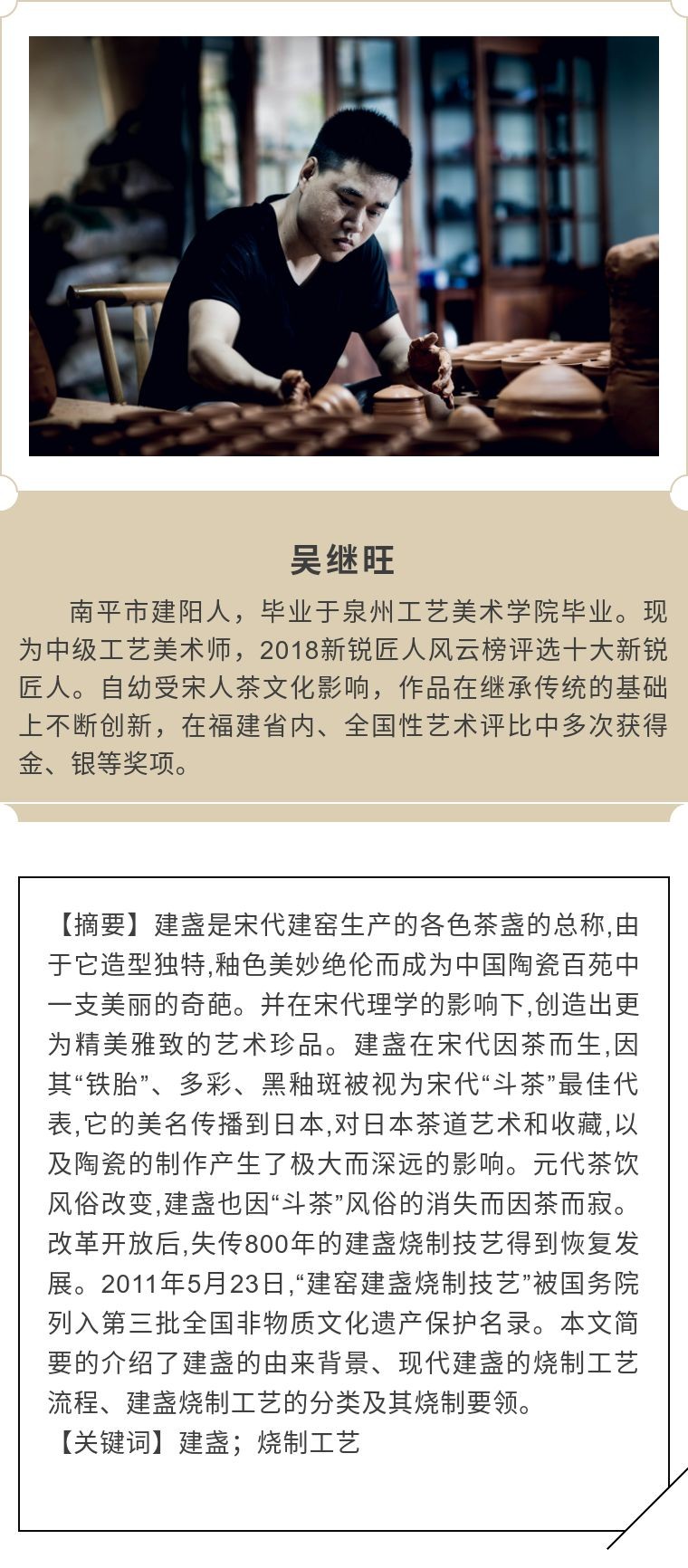 建盏产自“建窑”, “建窑”是中国宋代著名的民窑之一,因窑出建州、建宁府辖地而得名“建窑”, 有大量遗址位于今福建省南平市建阳区各地(古时隶建宁府瓯宁县)。作为闽北最有特色的黑釉瓷,以烧造风格独特的黑釉碗著称,俗称“建盏”。 它的制品在宋代已负盛名,一度经海上丝绸之路热销海外。建盏釉色品类丰富,尤以兔毫纹、油滴、鹧鸪斑、曜变等名贵瓷品饮誉海内外,在北宋中期至南宋中期曾经是建窑的鼎盛时期,后由于饮茶习惯、审美意识诸多方面的变化影响, 宋代之后,由于战乱等诸多因素,建盏烧制技艺逐渐走向衰落,以至停烧。 [1]改革开放后,失传800年的建盏烧制技艺得到恢复发展。2011年5月23日,“建窑建盏烧制技艺”被国务院列入第三批全国非物质文化遗产保护名录。