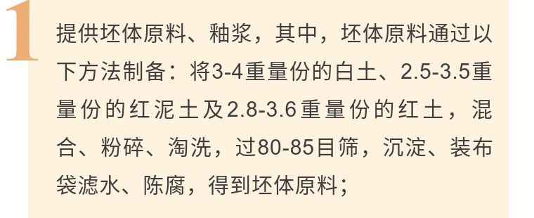 上述白土取自福建省南平市建阳区水吉镇南山村,红泥土取自福建省南平市建阳区水吉镇大梨村,红土和粘土均取自福建省南平市建阳区水吉镇枕头岭,釉矿石取自福建省南平市建阳区南林村。