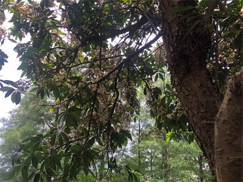 行走在这样的路上真的不热,偶尔还会飘来阵阵花香,抬头一看,正是这树上的花散发出来的香味。其实路上还有很多荔枝,只是这荔枝有点贵,偷摘一颗罚款50元。主要也是还没到采摘季节,如果荔枝红了,应该是可以随处买到的。
