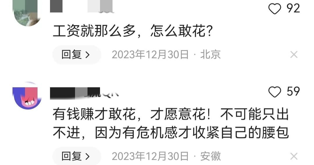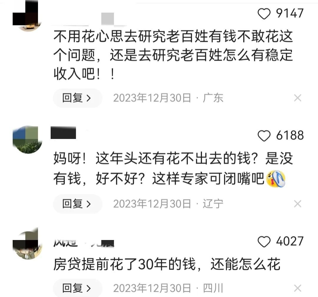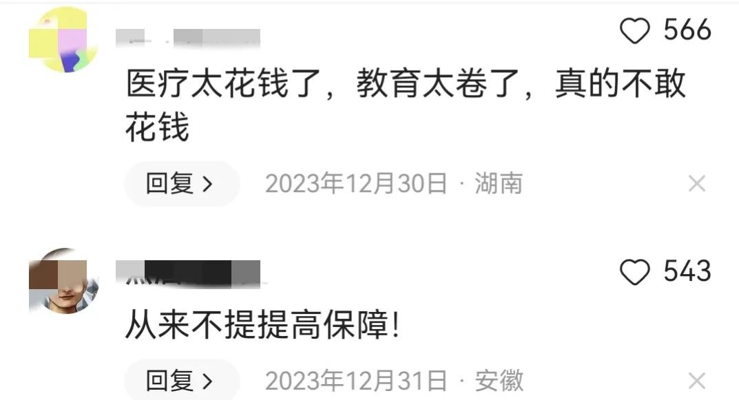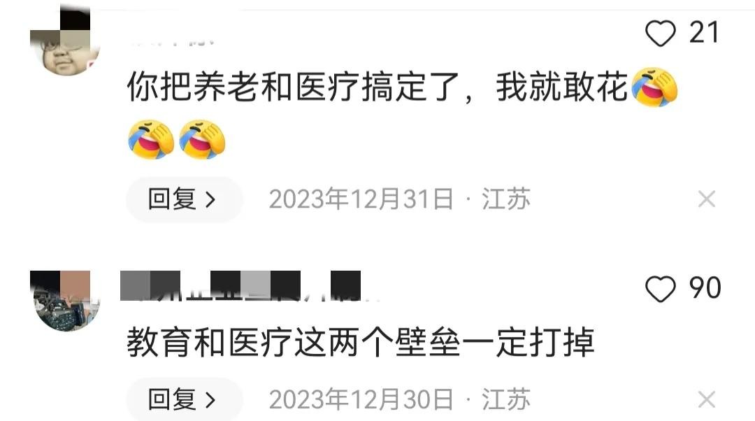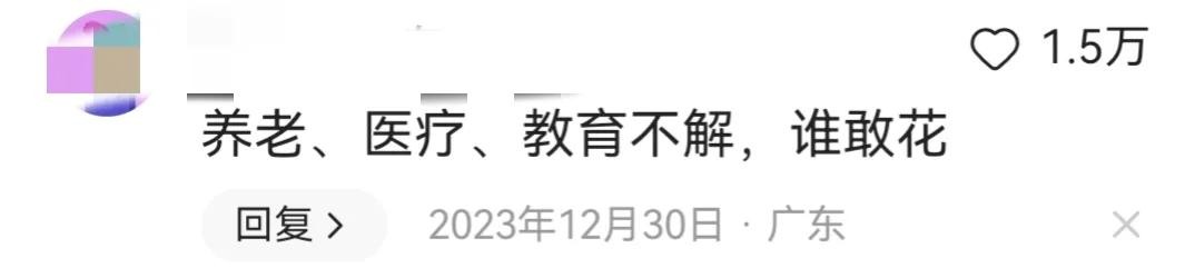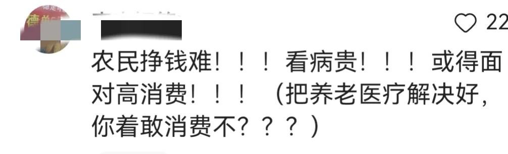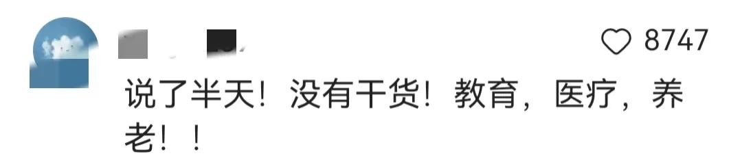 有网友在评论区说:“养老、医疗、教育不解,谁敢花”,“说了半天!没有干货!教育,医疗,养老!!”