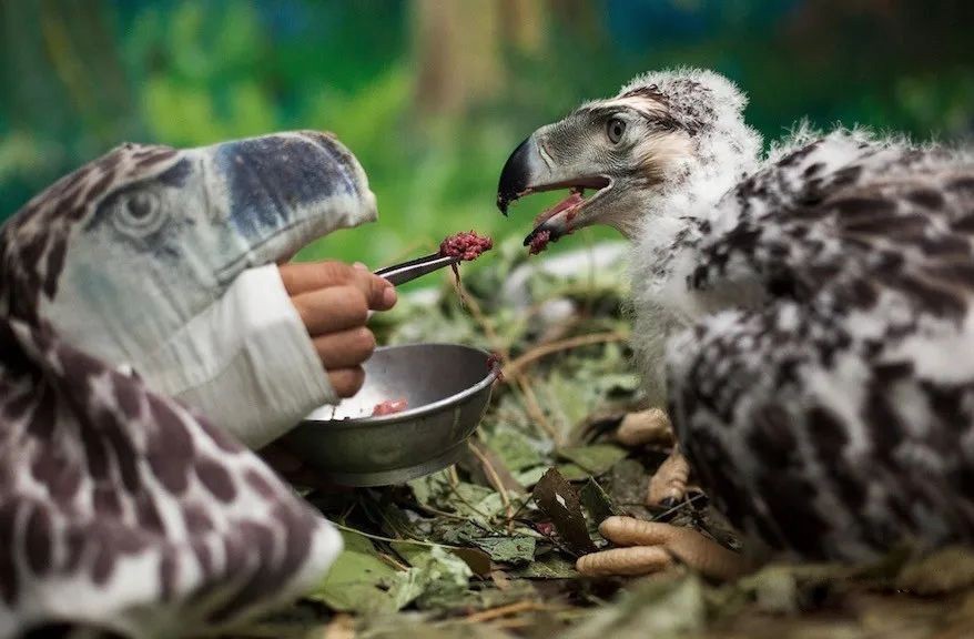 饲养员戴着成年鹰头形状的布偶喂食幼鸟