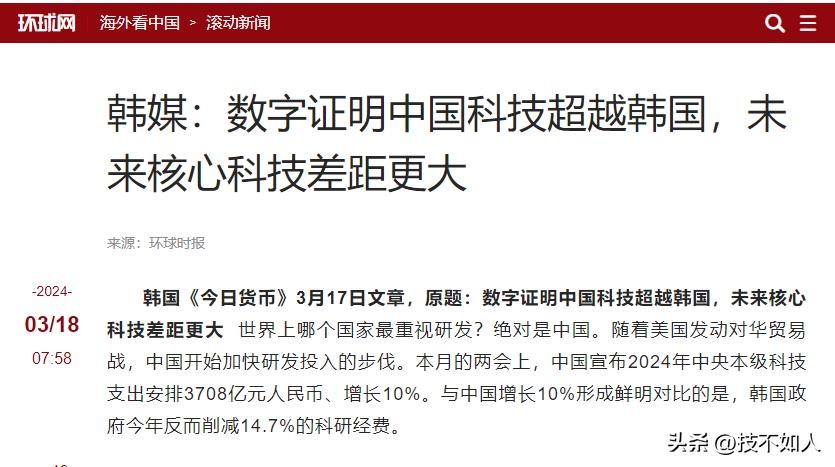 韩国媒体在报道我国科技支出大幅度上升时,强调了自主创新的重要性,并指出核心技术控制在他人手中等同于“受制于人”。