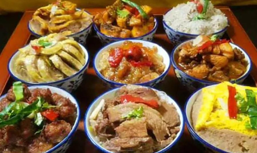 九碗三行子,是回族正宗的宴席,宴席上的菜,全部用九只大小一样的碗来盛,并要把九只碗菜摆成每边三豌的正方形。这样无论从南北或东西方向看,都成三行,故名“九碗三行”。“九碗三行子”中同样有丰富的文化内涵,它不只是一道简单的菜肴,如果取掉中间的水菜,再仔细看就是一个回族的“回”字,九在回族人的心目中,是个吉利的数字,当平整的丈盘里盛着九碗三行子端上来时,其实已涵盖了人们最朴素的祈愿:天下太平,这样,菜肴中的文化味道也就随着菜的香气飘过来了。