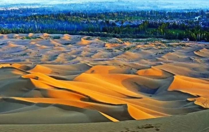 库木塔格沙漠,是世界上离城市最近的沙漠,是塔克拉玛干沙漠的一部分。站在鄯善老城向南望去,金色的大漠雄浑壮观,有“城中的沙漠”之称,因千百年来风向交汇点始终在鄯善老城南端,是世界上“绿不退,沙不进”奇观的缩影。面积2500平方千米,东西长62千米,南北宽40千米。