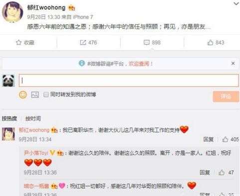 霍建华的经纪人郁红在微博上表示自己已经离职华杰,“感谢六年前的知遇之恩;感谢六年中的信任与照顾;再见,亦是朋友···”。在小编印象中郁红是霍建华的执行经纪人,曾经离职过一阵的,后来又回来了,她工作能力还可以。据说和霍建华交往过,不过好像是和谐分手。