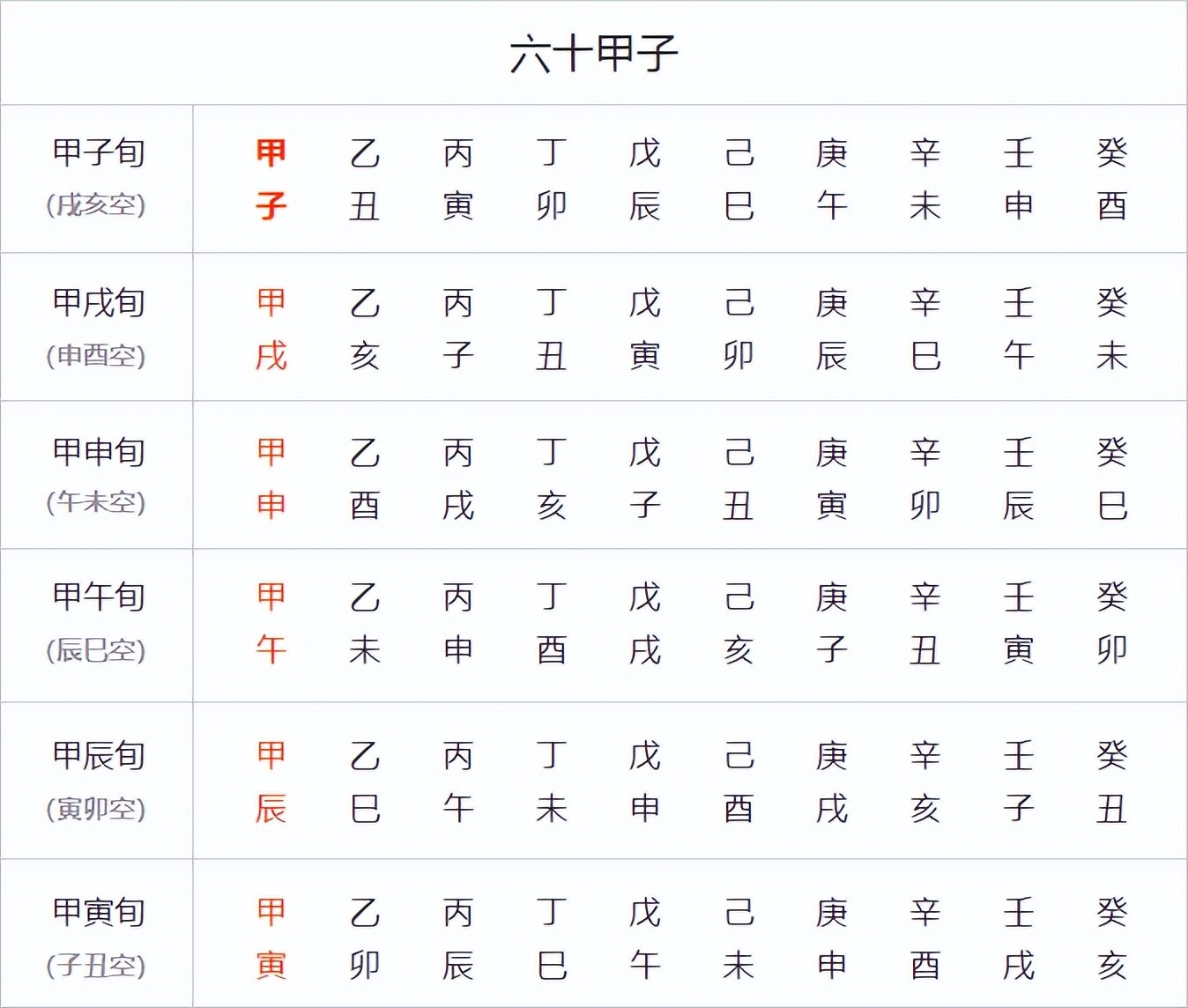 可以从上表看到,十天干和十二地支组合中出现六种形式:甲子、甲戌、甲申、甲午、甲辰、甲寅。这六种“甲”便指的是我们这里所说的“六甲”。