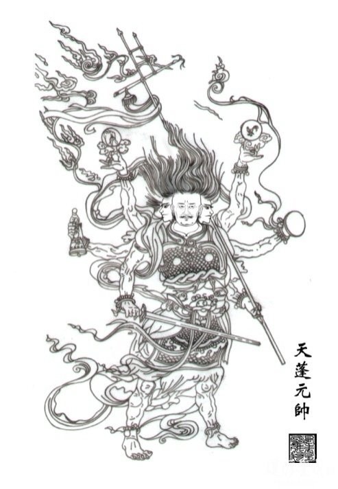 天蓬元帅其貌显三头六臂或四头八臂,均大忿怒像,执钺斧、弓箭、剑、铎、戟、索六物,身长五十丈,赤发、绯衣或黑衣、玄冠、金甲或赤甲、跣足;领神兵三十六万众,上辅玉帝、分司梵境,下临泉渊、整队元皇。