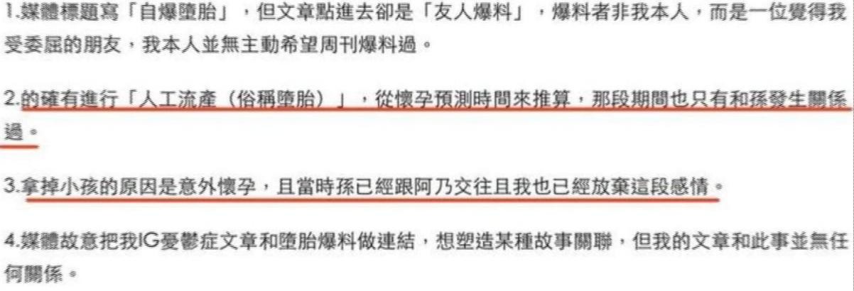 她不但公布了自己在孙安佐强烈要求下被迫打胎的事,还指责孙安佐在有正牌女友的情况下频繁找她约炮。