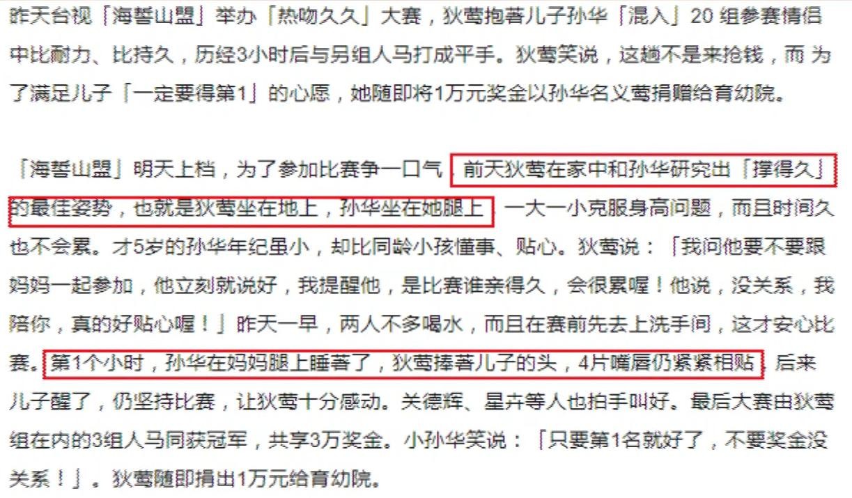 可令人无语的是,她的接吻对象竟然是儿子孙安佐。当时狄莺把儿子抱到大腿上,一连跟他吻了三个多小时,最后儿子累得当场昏睡过去。