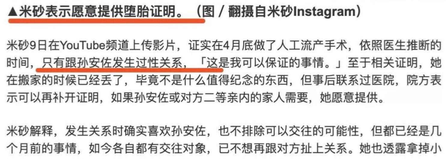 019年末,一位名叫米砂的女网红自曝,称其为了孙安佐去堕胎,怀孕4个月后人工流产。