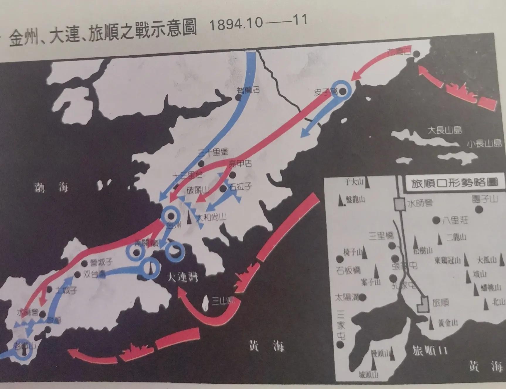 平壤战役之后,日本分两路向辽东进军。第1军在10月下旬越过鸭绿江,占领九连城,向辽东各地进犯,在进攻辽阳、奉天(今沈阳)受阻后,于12月中旬占领海城。第2军在10月下旬于辽东半岛的花园口登陆,偷袭全州,11月进攻大连湾,清军将领徐邦道等率部抵抗,终因寡不敌众而失守。11月下旬,日军攻占了清政府苦心经营15年的旅顺,包括花费巨资建成的当时东亚最大船坞的旅顺军港也在其中。日军在那里杀人如麻,使整个旅顺只剩下掩埋尸体的36个人。