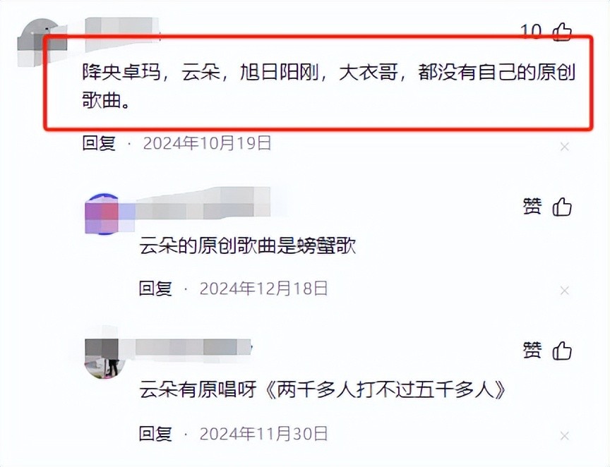 还有人说:“旭日阳刚和降央卓玛、云朵、大衣哥等人一样,都没有自己的原创歌曲。”