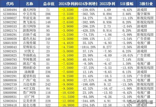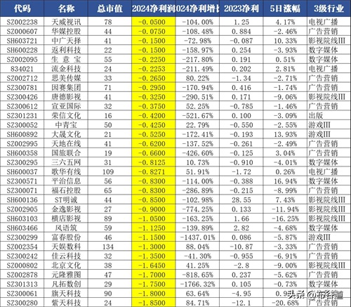 (3)有14股年报预告净利润亏损超5亿元,分别是昆仑万维、完美世界、ST广网、贵广网络、*ST文投、万达电影、广西广电、遥望科技、汤姆猫、博纳影业、湖北广电、华闻集团、华扬联众、ST凯文