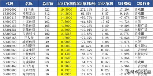 (4)8股业绩预告净利润高于1亿元,分别是ST华通、神州泰岳、芒果超媒、中文传媒、华数传媒、无线传媒、宝通科技、三人行