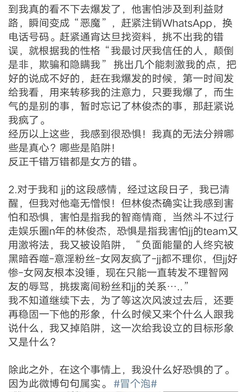 她现在对林俊杰没有憎恨,是害怕和恐惧,害怕她斗不过行走娱乐圈多年的林俊杰,恐惧是指林俊杰的团队为她设计陷阱!