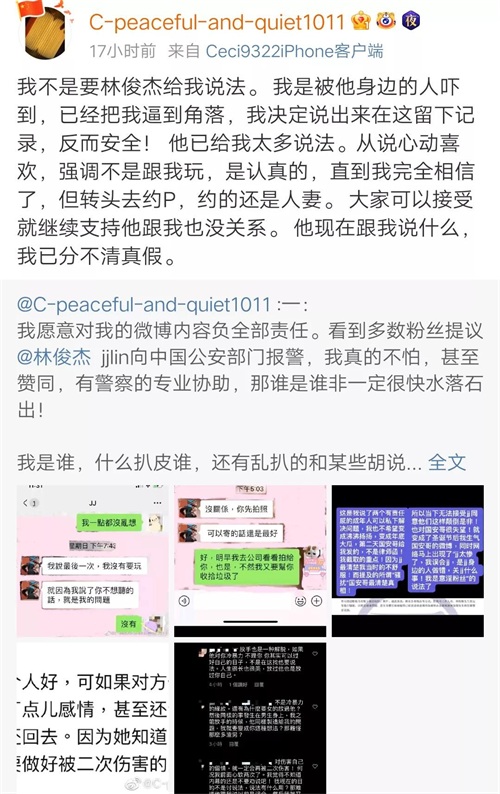 这个新加坡女网友还说她对自己的微博全部内容负责,她不怕林俊杰报警,有警察介入,谁是谁非就会水落石出。