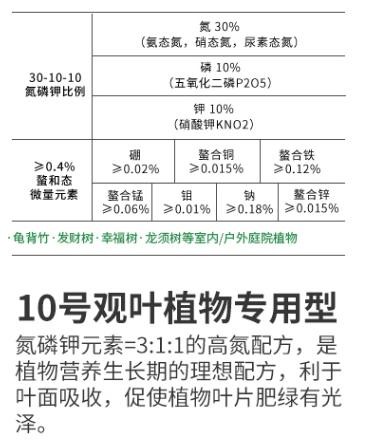 花多多10号肥料属于高氮肥,氮磷钾的比例为3:1:1,能促进枝叶的旺盛生长,叶片颜色会更加的浓郁,适合枝叶繁茂爬藤类的植物,对于长势有所帮助,可以让植物更快的生长叶子,使植物的叶片更加的有光泽,观赏价值更高。但是需要注意,不能给即将开花或处在花期的植物使用,否则会限制开花。一般情况下是用于观叶植物,所以盆景的使用率比较高。