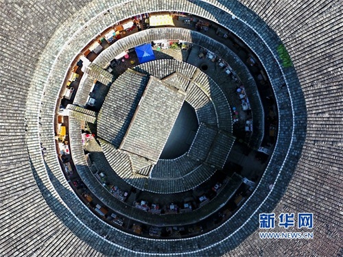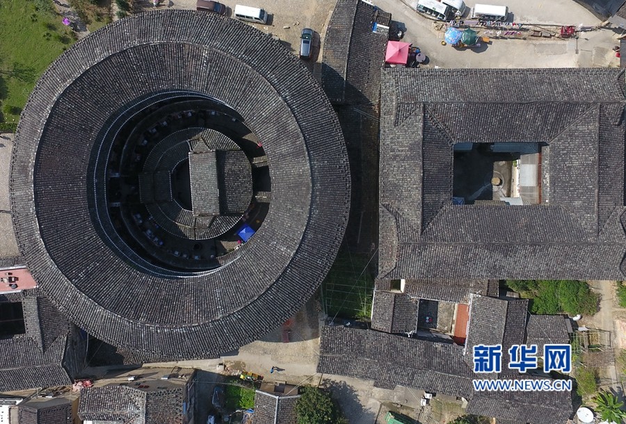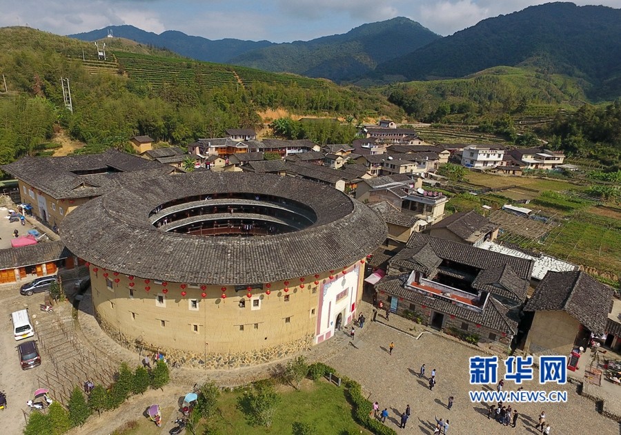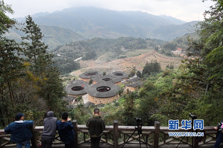 这是由中间的一座方楼和围绕其四周的三座圆楼、一座椭圆楼组成的大型土楼民居——福建土楼(南靖)景区的田螺坑土楼群(11月23日摄)。新华社记者林善传摄