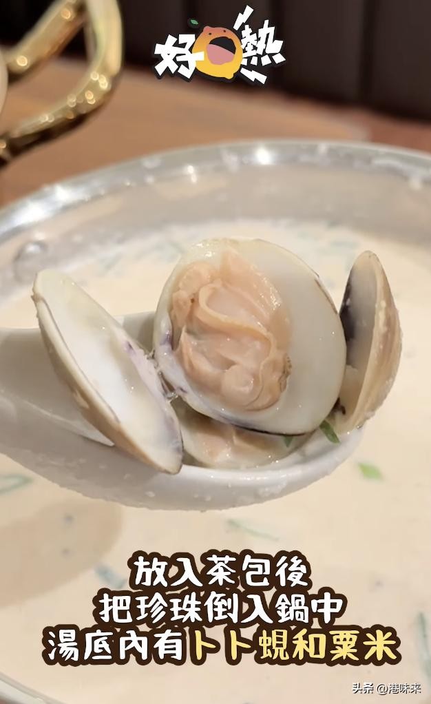 珍珠奶茶火锅的汤底选用了猪骨汤,里面还有粟米、卜卜蚬,而客人需要亲手加入乌瓦红茶包和珍珠。先尝一口汤,满满的奶香骨汤味,有点类似豆乳汤,特色的洋葱味道十分突出,但奶茶的味道并不是很突出哦!