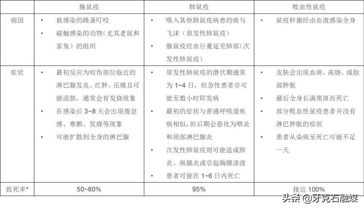 肺鼠疫:毒性最强,死亡率极高,潜伏期可能只有短短 24 小时。通常是腺鼠疫后期感染传播至肺部所致。除全身表现外还会出现特异呼吸道感染症状。
