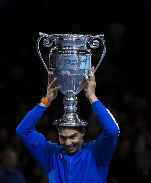 新华社照片,伦敦,2019年11月16日(体育)(3)网球——ATP年终总决赛:纳达尔加冕年终世界第一11月15日,纳达尔高举年终世界第一奖杯。当日,在2019ATP世界巡回赛年终总决赛第六日单打小组赛中,西班牙选手纳达尔以2比1战胜希腊选手西西帕斯,但由于同组兹维列夫战胜梅德韦杰夫,纳达尔遗憾出局。赛后纳达尔获得年终世界第一奖杯。新华社记者韩岩摄