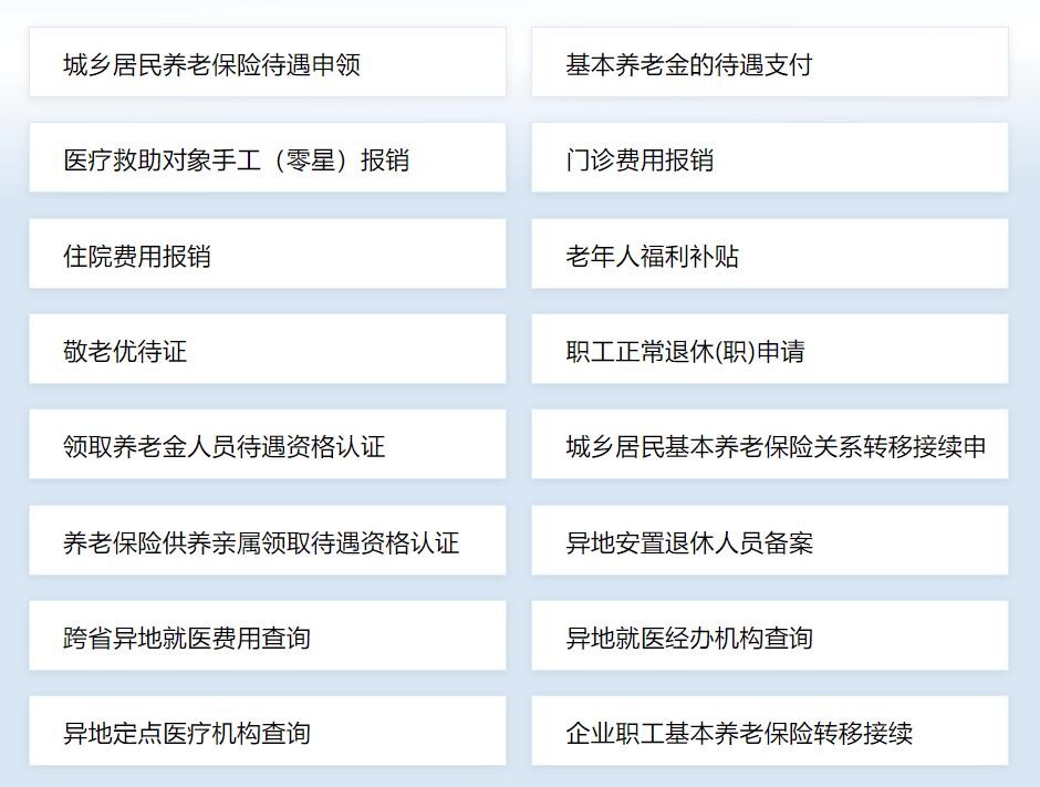 目前,老年人办事服务专区汇聚了城乡居民养老待遇申领、老年人福利补贴、基本养老金待遇支付、领取养老金人员待遇资格认证、异地安置退休人员备案、跨省异地就医费用查询等16项涉及社保、医保领域的老年人常办的高频服务事项,方便老年人网上查询和办理相关服务。