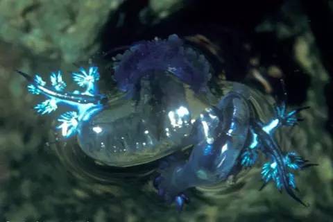 我们可以看到图中两个海蛞蝓在咬中间的僧帽水母。