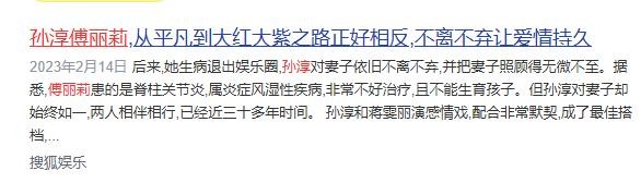资料参考:2023-02-14搜狐娱乐——孙淳傅丽莉,从平凡到大红大紫之路正好相反,不离不弃让爱情持久