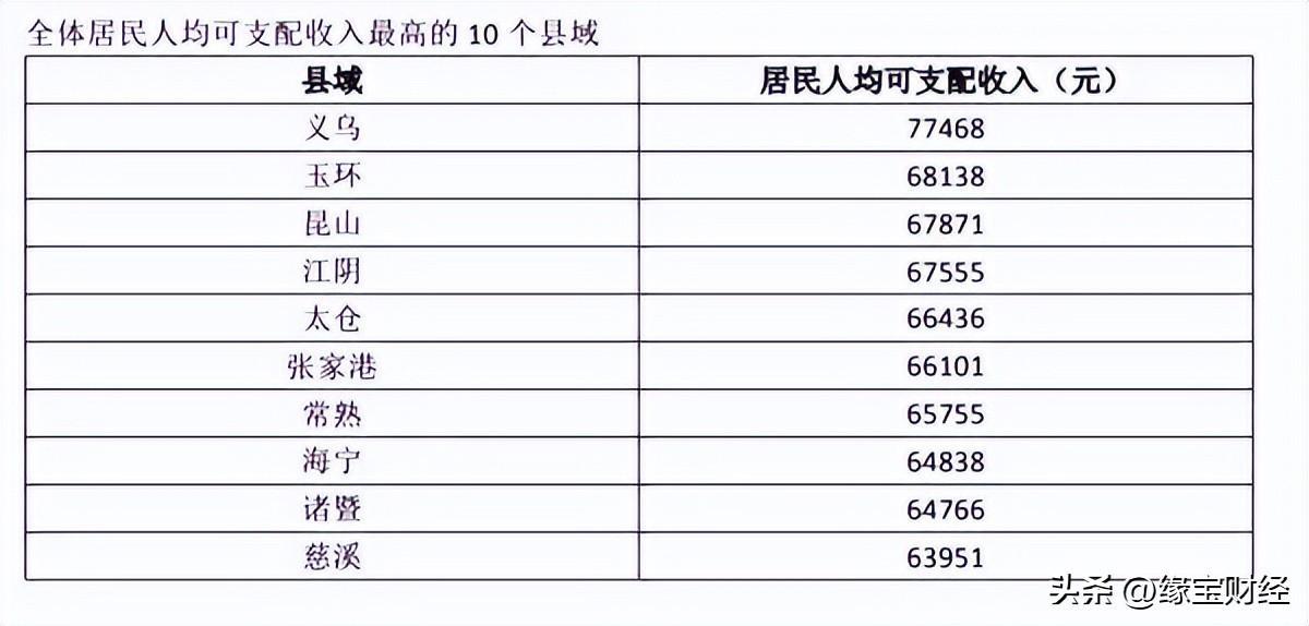 那么在2021年,居民人均可支配收入最高的10个县域分别是义乌、玉环、昆山、江阴、太仓、张家港、常熟、海宁、诸暨、慈溪。其中义乌排名第一,超过北京、深圳、广州三大一线城市,仅次于上海。这么里面有你们的家乡吗?