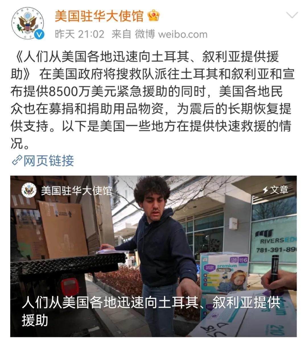 美使馆微博发布 美各地援助土耳其、叙利亚 我写文章痛斥无耻虚伪