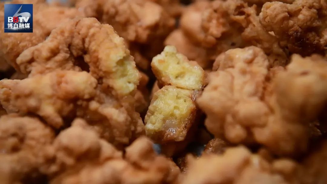 汤勺固定炸20秒左右,左右晃动汤勺,面团脱勺,小火慢炸,偶尔上下翻面,炸至金黄,一个个饱满金黄的客家芙蓉肉就可以出锅啦~