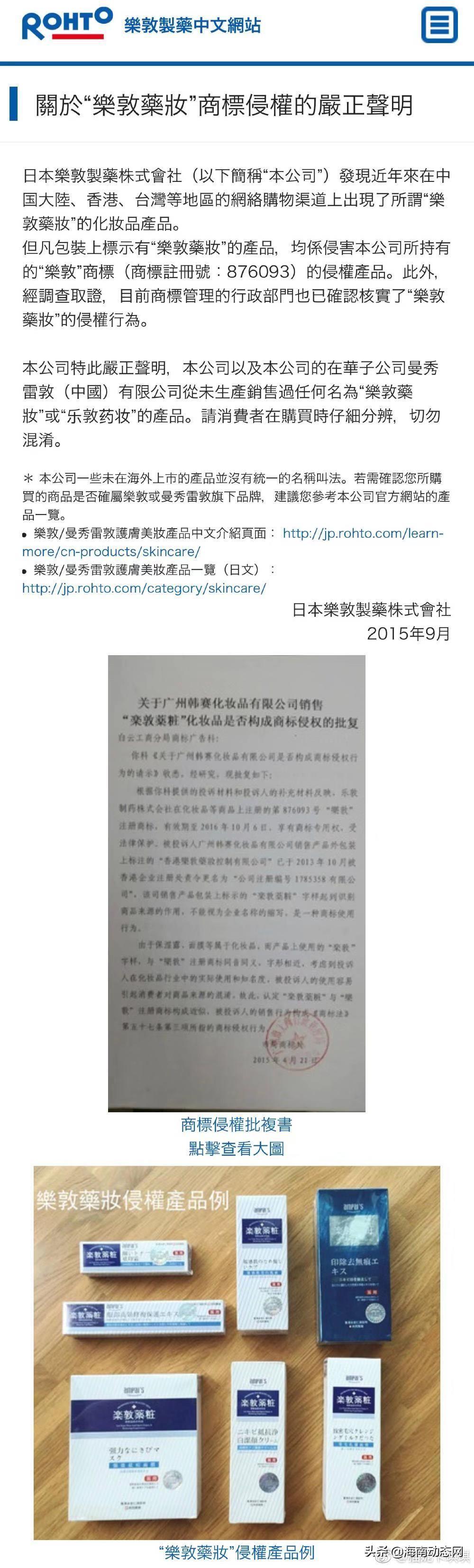 3.日本乐敦制药中文官网曾发布声明「乐敦药妆商标侵权」,如果是日本香港联合研发,不可能会商标侵权,唯一的可能就是两者没有关系。