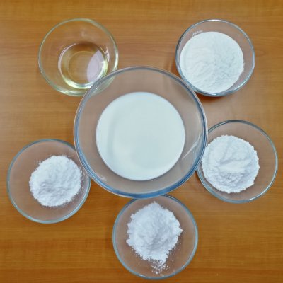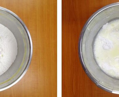 3、在混合好的粉类中加入色拉油,牛奶搅拌均匀。
