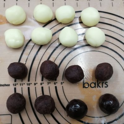 6、将面团分割成25g/个,搓成圆球。 同样,馅料也分割成25g/个,搓成圆球。 (如果一次性做的比较多,后面一时半会轮不到的小球球,用保鲜膜蒙一下免得干掉)