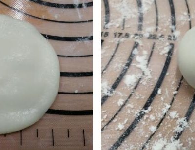 8、取一个冰皮,包裹住馅料并搓圆。 在搓好的圆球上薄薄的裹上一层手粉,再扑去多余的,用月饼模按出喜欢的样子,即可。