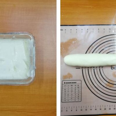 5、将蒸好的面糊取出,待稍稍冷却不烫手之后,戴一次性手套揉成一个光滑的面团,并搓成长条状。