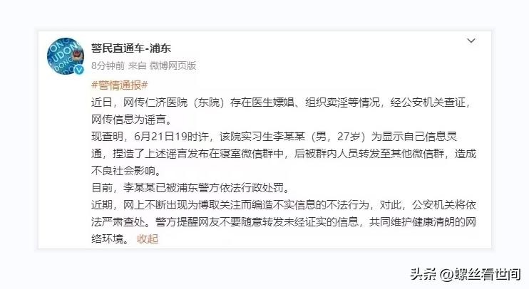 网传上海仁济医院内部嫖娼卖淫事件后续,警方:造谣者已行政处罚