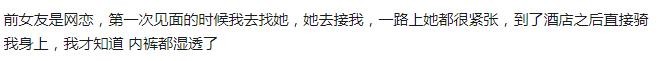 8、我老婆追的我,刚开始确定关系10来天的时候,晚上出去逛,回来的时候把我拉去小角落亲嘴,本来没啥,结果亲着亲着把我手拿到她 上去了,懵了一下,我也就直接伸进去上手了,过几天一个周末,直接那啥了