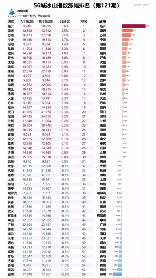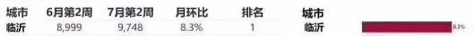 根据冰山指数数据,临沂7月第二周房价为9748元/平方米,8月第二周房价为10295元/平方米,月环比增长5.6%。