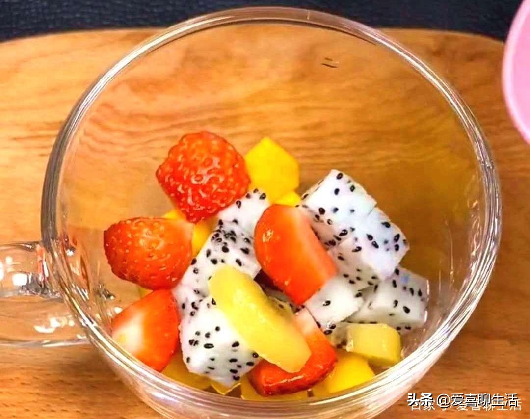 第一步 水果切块,把草莓6个对半再对半切块,芒果1个切成小块,火龙果半个也切成小块,放入大碗中。