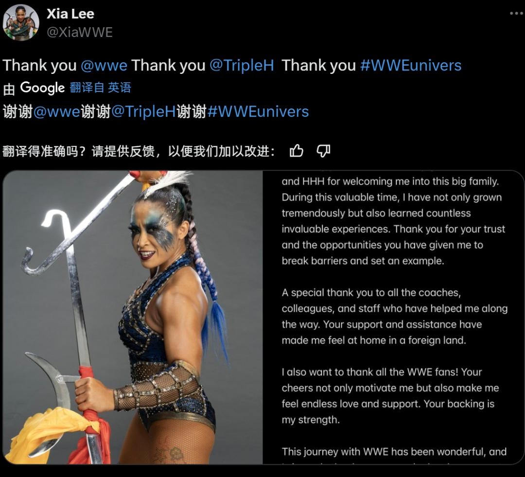 我加入wwE已经7年多了,作为中国第一位女超级明星,我感到无比自豪!我衷心感谢wwe和HHH欢迎我加入这个大家庭。在这段宝贵的时间里,我不仅成长了很多,也学到了很多宝贵的经验。感谢您的信任,给我机会打破障碍,树立榜样。特别感谢所有帮助过我的教练、同事和工作人员。你们的支持和帮助使我在异国他乡感到宾至如归。我还要感谢所有的WwE粉丝!你们的欢呼不仅激励着我,也让我感受到无尽的爱和支持。你的支持就是我的力量。与WwE的这段旅程非常精彩,我真诚地感谢每一个参与其中的人。这不是结束,而是一个新的开始!让我们一起拥抱更多精彩的时刻!
